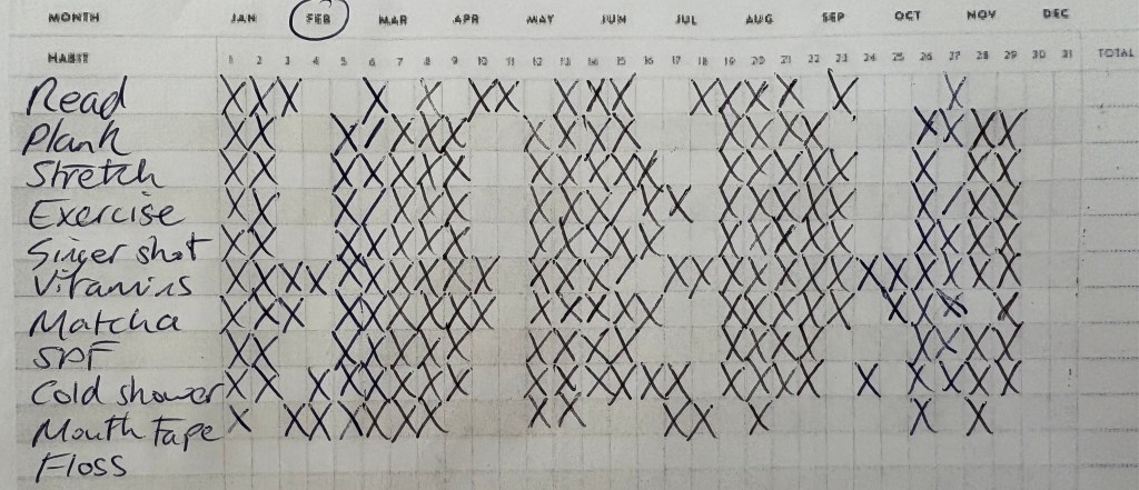 Habit tracking changed my life, in an amazing way. I started doing it during my Dad’s health decline when I was spending a lot of time at home, when trying to maintain a routine of some sort, and adjusting to the change of location, access to the gym and various other factors. It helped me gain and maintain a very good degree of health/fitness and massively helped my emotional capability.